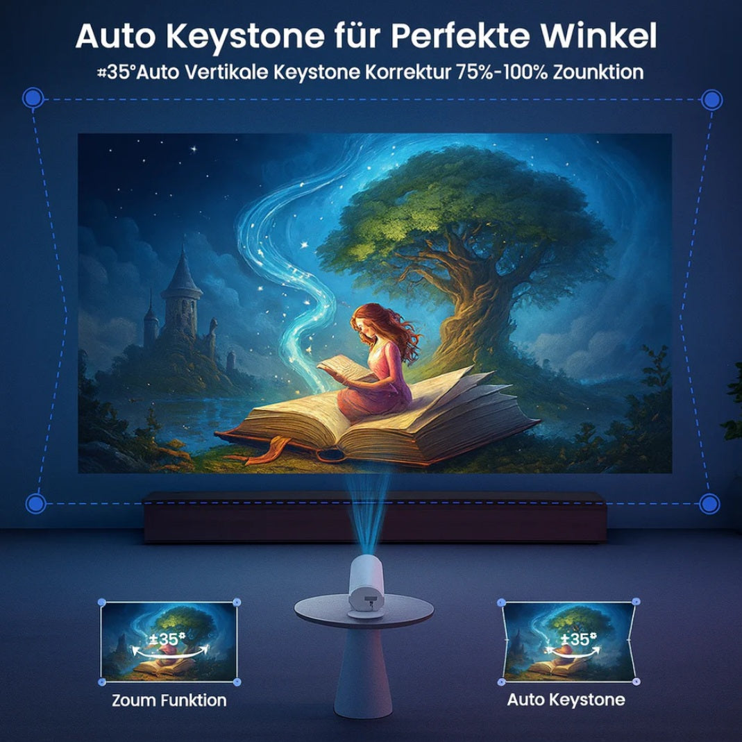 Der Projektor wirft die Buchseite oder Textinhalte groß und klar an Wand oder Decke. Du kannst Fokus, Helligkeit und Winkel individuell anpassen – ideal zum entspannten Lesen im Bett oder auf dem Sofa.